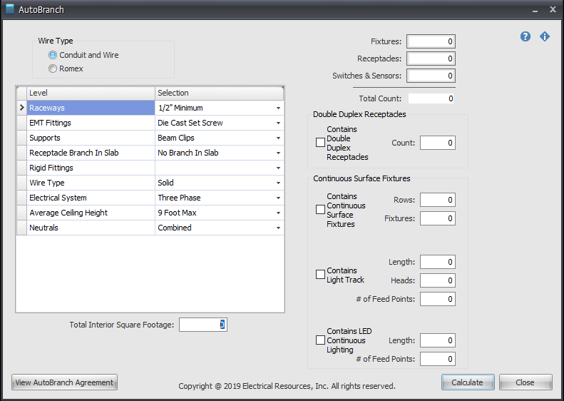 After switches, light fixtures, convenience receptacles and occupancy sensors have been counted, simply enter the totals into AutoBranch. If counts change, you can re-calculate as many times necessary.