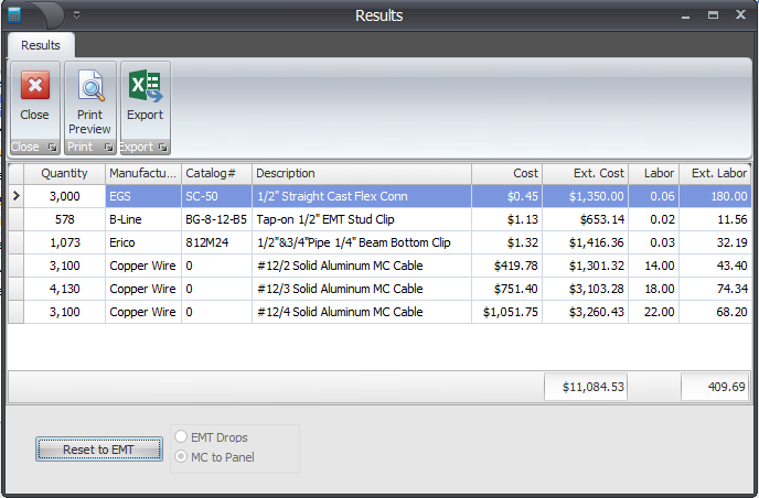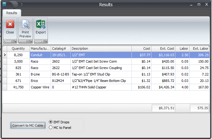 Once counts have been entered into the estimate, Branch Circuit Calculator automatically calculates all the conduit, wire, fittings and supports for those circuits. AutoBranch instantly changes the hard-wired bill of materials to MC cable. Results can be exported to Excel. Whether it’s a $50,000 job or a $5,000,000 job, AutoBranch calculates the conduit, wire, fittings and supports in seconds.