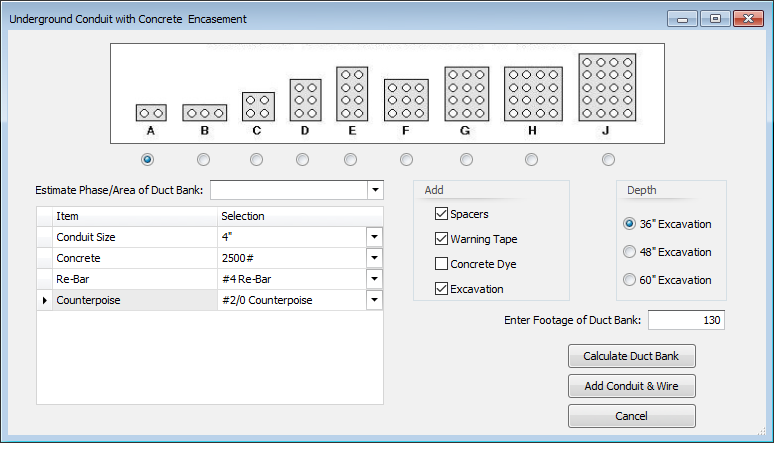 AutoDuctBank calculates conduit, concrete, excavation, rebar, counterpoise, warning tape, concrete dye, and spacers.